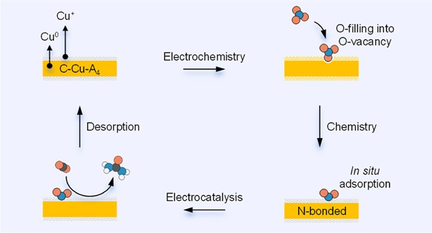 团队进一步通过新型电化学-化学循环策略,非晶态氧化铜包覆的晶态铜纳米线可实现0.89 mol h–1g–1的破纪录尿素产率。机理研究揭示了三步催化循环:电还原生成零价铜和氧空位;氧空位通过氧原子插入介导硝酸盐活化,自发产生氮键合亚硝酸盐(*NO2)同时将Cu0氧化为催化活性位点Cu+;Cu+催化*NO2与CO2间的碳氮偶联生成尿素分子。该路径规避了传统速率限制步骤的硝酸盐还原过程,将尿素合成的电子转移数从16e–降至12e–。值得注意的是,直接使用亚硝酸盐无法生成Cu+或氮键合中间体,反而形成氧键合物种并显著降低碳氮偶联活性,这一发现颠覆了传统认知。相关成果以题为“Achieving Record-Breaking Urea Synthesis on Crystalline-Amorphous Hybrid via Electrochemical-Chemical ”发表在国际顶级期刊《Journal of the American Chemical Society》上,化学化工学院严大峰副教授为共同第一作者。
