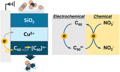 高效稳定的催化剂活性中心对促进电催化尿素合成至关重要。团队提出通过电化学步骤与化学步骤的耦合,利用富勒烯(C60)作为电化学还原过程中的氧化还原活性电子介质,有效抑制了带正电铜位点(Cuδ+)的不可逆还原失活。具有电子接收能力的富勒烯形成离子(C60n–),与硝酸根离子发生自发化学氧化还原反应,生成亚硝酸根离子并再生中性C60(C60n–+ NO3–→ C60+ NO2–)。该循环机制在优化整体反应路径的同时实现了电子传递闭环。尿素产率显著提升至385.9 mmol h−1g−1,并展现出长期稳定性。本成果以题为“Closing Electron Transfer Loop to Boost Electrocatalytic Urea Synthesis”发表在国际顶级期刊《Angewandte Chemie》上,化学化工学院严大峰副教授为共同通讯作者。