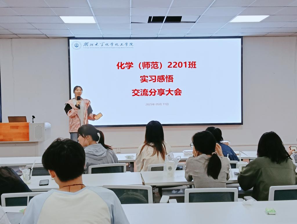 为总结化学师范专业学生的实习经验,促进教学技能交流与提升,化学化工学院化学(师范)2201班于2025年5月11日晚19:00-21:30在化院D216会议室举办实习交流分享大会。会议由班主任李玢洁老师主持,全体学生齐聚一堂,共同回顾实习历程,分享成长感悟。