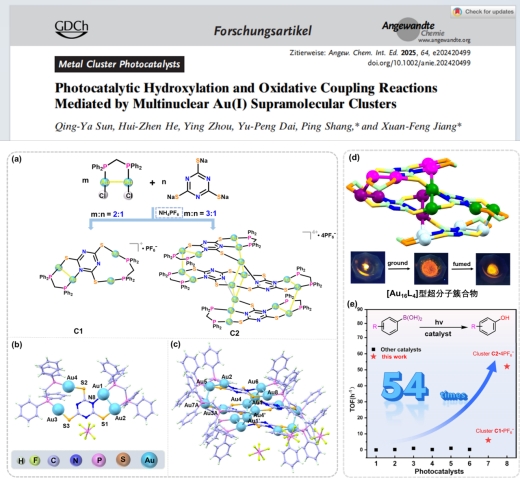 (1) Qing-Ya Sun; Hui-Zhen He; Ying Zhou; Yu-Peng Dai; Ping Shang*; Xuan-Feng Jiang*, Photocatalytic Hydroxylation and Oxidative Coupling Reactions Mediated by Multinuclear Au(I) Supramolecular Clusters. Angewandte Chemie International Edition, 2025, 137, e202420499.