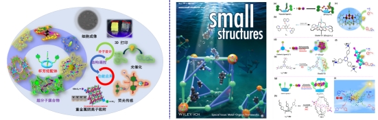 利用含氮硫位点的杯芳烃配体作为连接子,与币金属(一价Cu、Ag和Au)配位模块自组装得到一系列含有金-金成键中心的超分子簇合物材料。这类金属有机超分子簇合物材料在细胞成像、荧光染料和传感、OLED发光材料、光催化以及“人工自组装酶”催化等方面有潜在应用价值。部分成果以全文形式发表在国际化学顶尖期刊《美国化学会志》上(Xuanfeng Jiang(第一或者通讯作者), et al, Angewandte Chemie, 2025, 64, e202420499;JACS, 2014;Small Structures, 2022, 2100155; CrystEngComm, 2021, 23, 7179–7185; New Journal of Chemistry, 2021, 45, 8910–8917; Inorganica Chimica Acta, 2022, 530, 120676; Journal of Cluster Science, 2022, 33, 2545–2550; Journal of Solid State Chemistry, 2022, 306, 122811; Journal of Molecular Structure, 2022, 1263(5), 133120; Crystal Growth & Design, 2022, 22, 4926–4934; Inorganic Chemistry, 2022, 61, 14267–14274; Crystal Growth & Design, 2023, 23, 1477–1485; Dyes and Pigments, 2023, 214, 111209; Inorganic Chemistry, 2023, 62, 15403-15411; Inorganic Chemistry, 2023, 62, 2652–2662; Inorganica Chimica Acta, 2023, 544, 121213; Dyes and Pigments, 2024, 222, 111868; Chemistry of Materials, 2024, 36, 2027−2038; Journal of Solid State Chemistry, 2024, 330, 124464。Journal of Materials Chemistry A, 2024, 12, 6634–6643; Crystal Growth & Design, 2024, 24, 6710-6718;